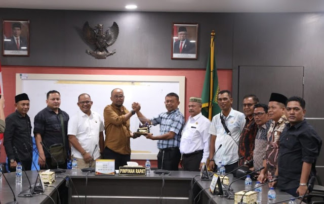 Diakhir pertemuan tersebut, Ketua DPRD Aceh Timur Fattah Fikri bersama Wakil Ketua II DPRD Kota Batam Muhammad Yunus Muda saling memberi cendramata dan fhoto bersama. (M Ikhsan)
